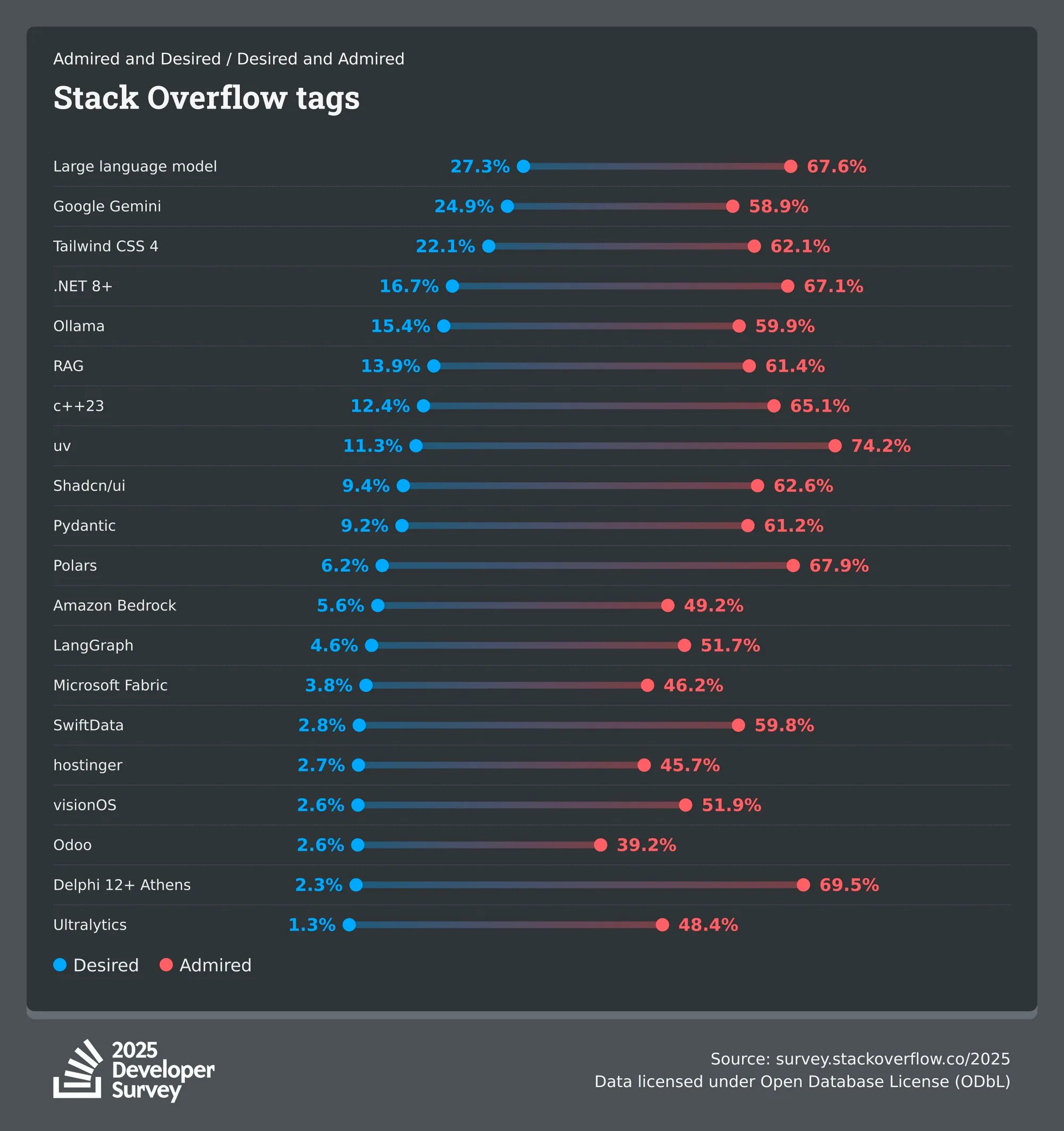 Charlie Marsh, the founder of Astral, the company behind uv and other extremely fast dev tools, has recently shared results from the 2025 Stack Overflow developer survey, and uv is the most admired technology. Now, to be honest, I don’t know how to interpret that specific statement in any meaningful way. But what I get from this is that many developers know and like uv!